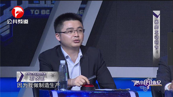 在5月12日播出的节目中,王悦生总经理与其他在场嘉宾一同聆听了三位选手的创业项目及融资计划。王总结合自己丰富的项目运营及市场运作经验,帮助选手分析项目市场前景、投资价值和未来发展方向,并针对项目的运作模式、产品的规范化生产等方面提出了专业的、极具参考价值的建议,助力选手实现品牌发展与财富积累的最大价值,得到了现场嘉宾、参赛者、观众的一致认可,掌声不断。