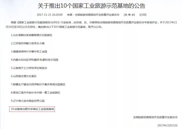 - 11月21日,全国旅游资源规划开发质量评定委员会发布公告,公布10个国家工业旅游示范基地,安徽省合肥市荣事达工业旅游基地成为安徽省唯一入选单位。