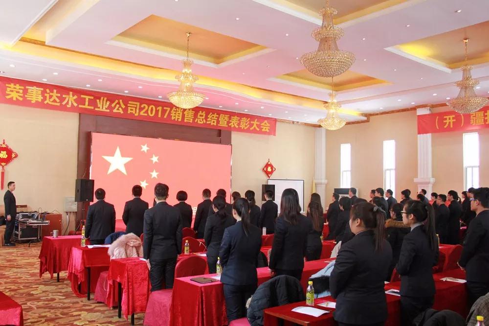 大会开场,荣事达水工业公司销售精英起立合唱《歌唱祖国》,唱响健康中国梦,歌唱属于自己的凯歌,洪亮的歌声拉开了“荣事达水工业公司2017销售总结暨表彰大会”帷幕。