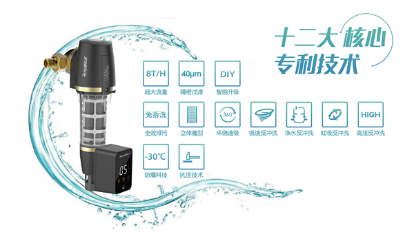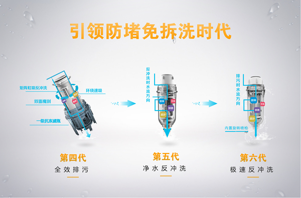 此次荣事达智能前置过滤器系列所带来的最大不同,便是其独有的“防堵免拆洗技术”。作为企业定向研发的专利技术,有效解决了前三代传统前置过滤器“易堵塞,拆洗难”的致命弊病,五款新品从第四代到第五代再到第六代,可以说是防堵免拆洗技术的梯度升级。