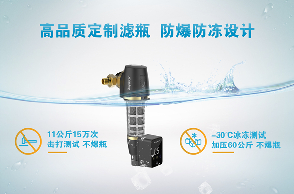 对于传统前置过滤器来说一直存在一个隐患,那就是在低温冰冻或是高压水锤等情况下,容易引发滤瓶爆裂,令许多用户头疼不已。其实,回归根本来说,还是因为滤瓶材质不佳。荣事达为攻克这一难题,可谓是下足功夫。智能前置过滤器滤瓶采用独特配方和原装进口材料,不含双酚A,滤瓶无注塑点,并通过NSF、SGS检测,经过改性配方与防爆防冻极限抗压测试,11公斤15万次击打不爆瓶,-30℃冰冻测试加压60公斤不爆瓶,滤瓶综合性能有着质的飞跃,保证用户使用安心。