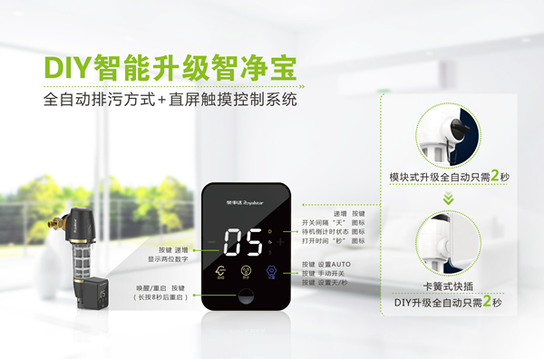 值得一提的是,为进一步方便用户使用,提升产品体验,荣事达为第五代、第六代智能前置过滤器分别打造两款定制化新品,量身融入智净宝自动排污模块,2秒即可直接加装升级。专属定制的DIY智净宝配备了直屏触控排污系统,轻触即可任意设置排污时间和排污天数,实现完全自主排污;独特排污阀闭合自检能力,彻底排除漏水风险,方便省心,使用无忧。