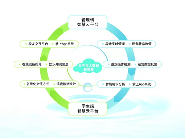 此外,荣事达着眼校园直饮水的互联网化建设,依托先进的云端大数据平台、无线网络体系和智能一卡通技术等,创新打造ultraWiFi智慧管理系统,系统直连ultraWiFi净水主机、开水器、饮水机等终端定制设备,实现精细化管理。学生在使用中不仅能查询饮水消费记录、在线报修设备、与校友交流等,还能拥有多元化充值方式选择,充分享受快捷的智能化饮水体验。 同时设备运营商也可通过电脑或手机APP端口接入云数据平台,异地监测工程运行状况,实时掌握水电成本、消费收益、设备状态等数据信息,日常管理更简单。