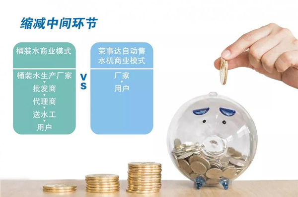 桶装水的价格包含厂家生产成本、批发商差价、代理商差价、运输成本、送水工人力成本等诸多费用,中间环节太多,最终还是有消费者买单,而自动售水机则是厂家直面用户,大大缩减中间环节,让利于客户,一桶水的价格相比市面上的品牌桶装水价格要少50%以上,大大节省企业开支。