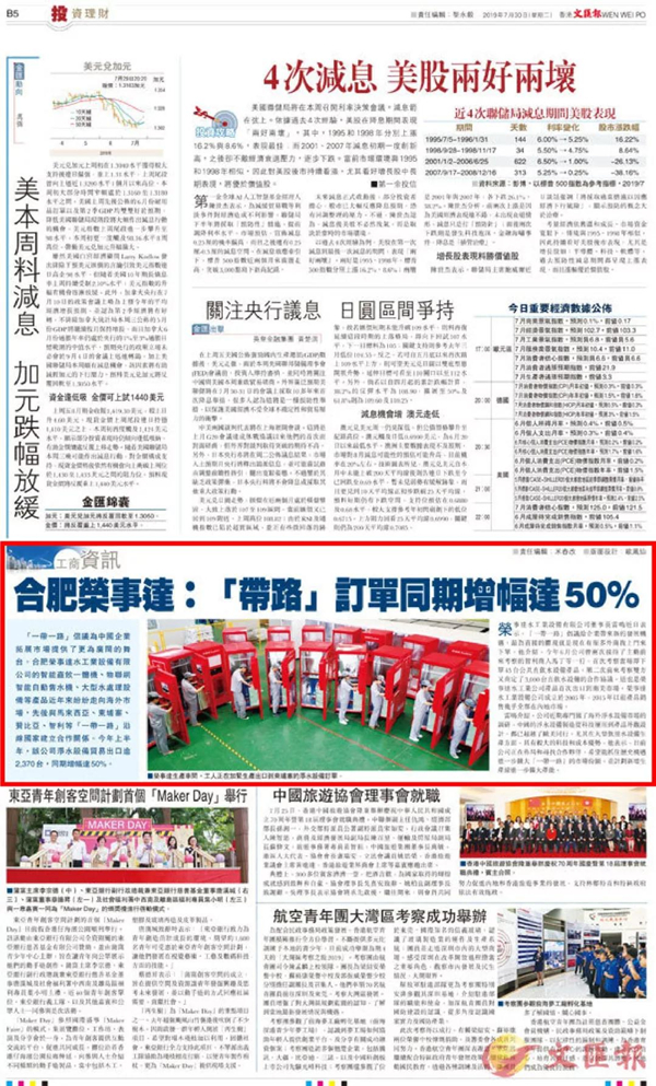 香港文汇报 《合肥荣事达 “带路”订单同期增幅达50%》