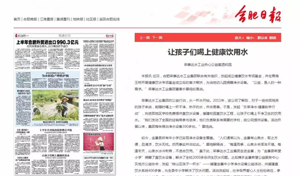 今年7月,荣事达快速的发展步伐吸引了香港文汇报、安徽日报、合肥日报、人民网、新华网、工商导报、江淮时报等对企业积极参与“一带一路”情况进行了集中宣传报道。安徽日报 《荣事达水工业“绿色制造”量身定制之路》